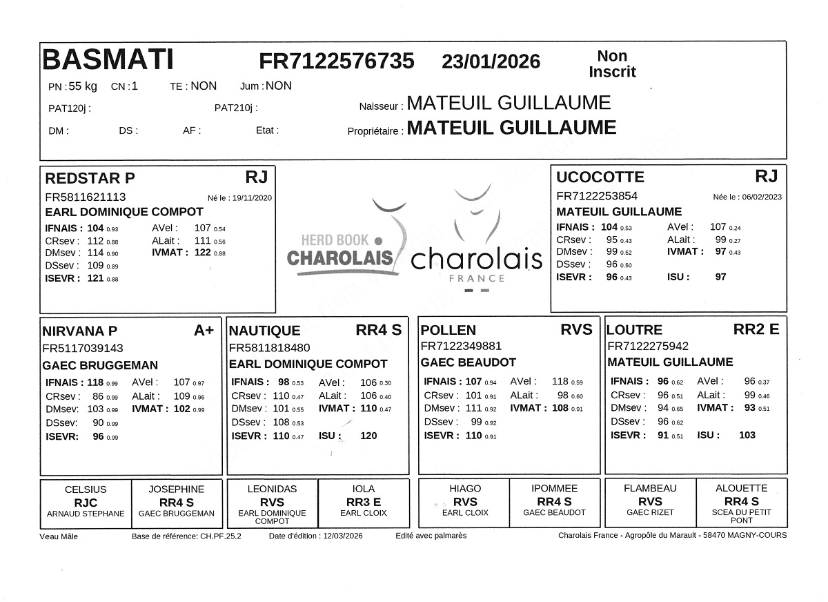 BASMATI, veau de génisse né seul ayant un très bon équilibre DM et DS.