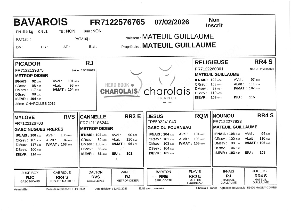 BAVAROIS fils de PICADOR dont 100% de ses mâles vont à la reproduction. Issu de la plus grosse vache de l'élevage.